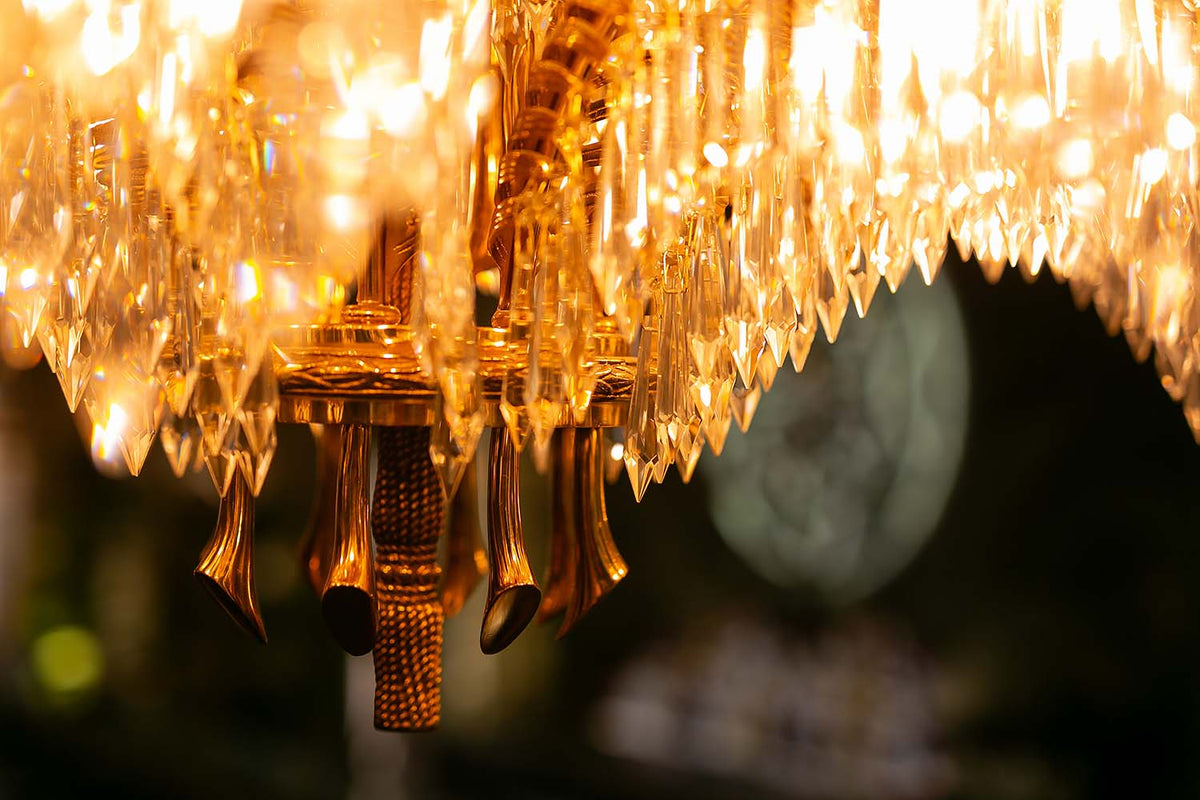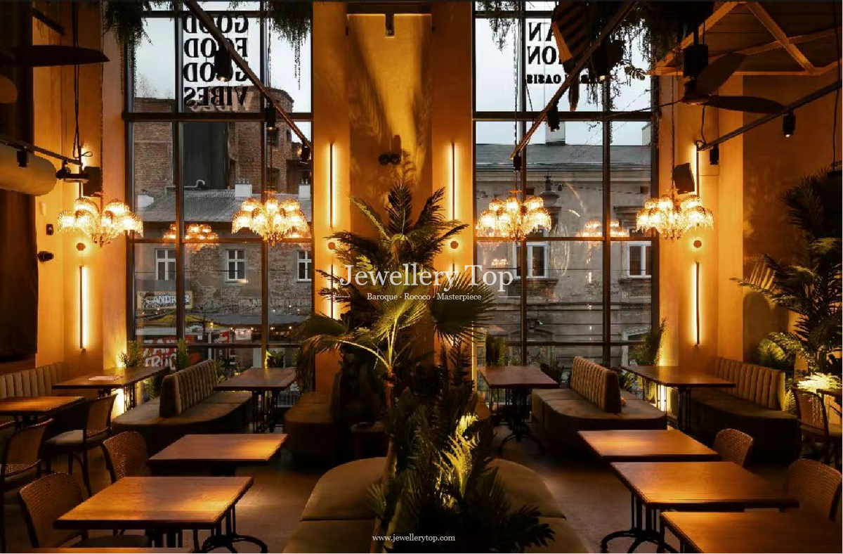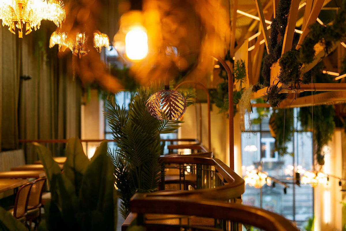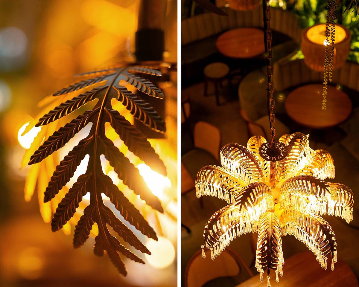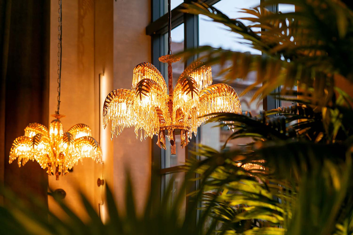 A Polish restaurant blending tropical greenery with French luxury brass crystal palm chandeliers.